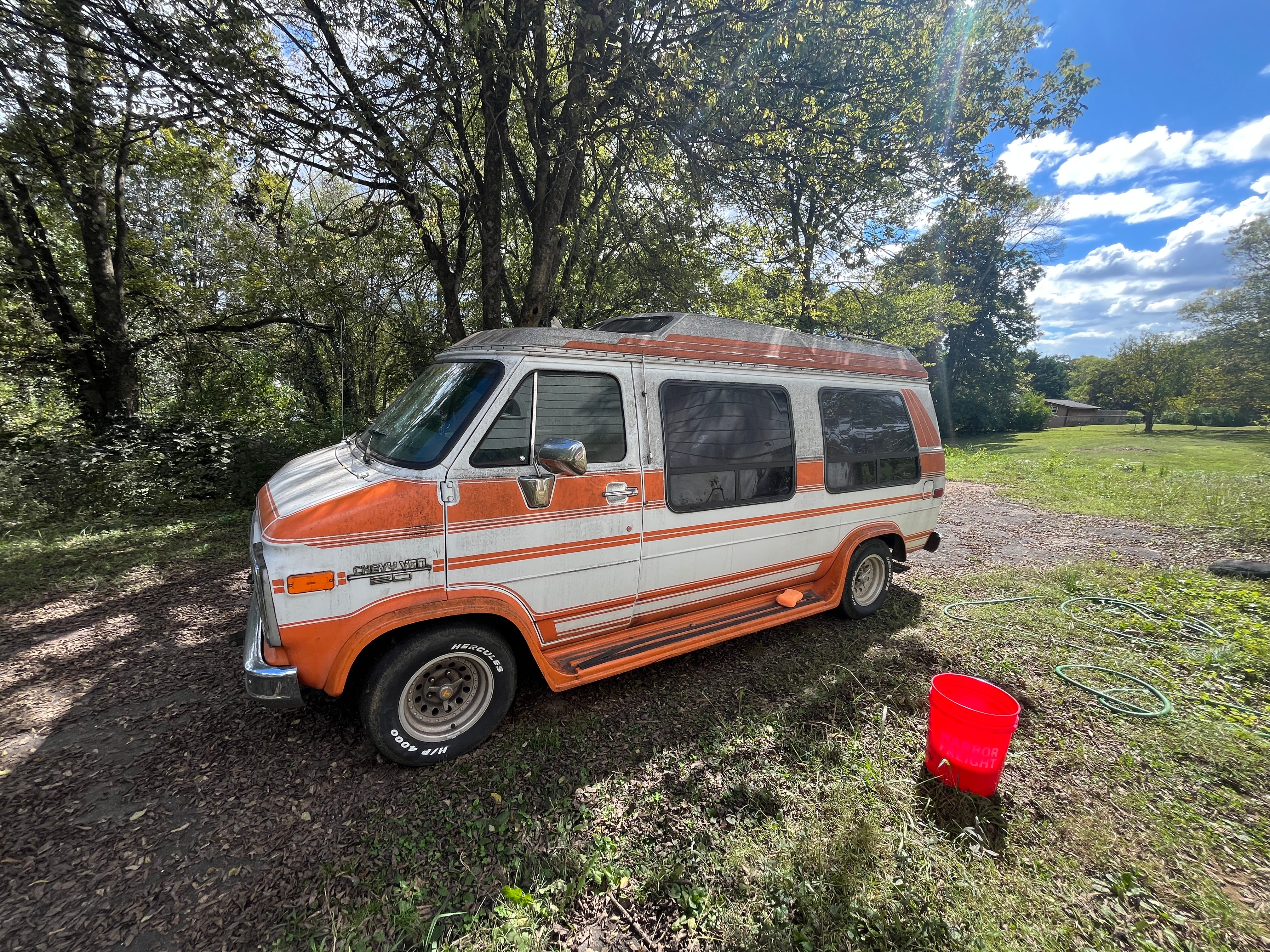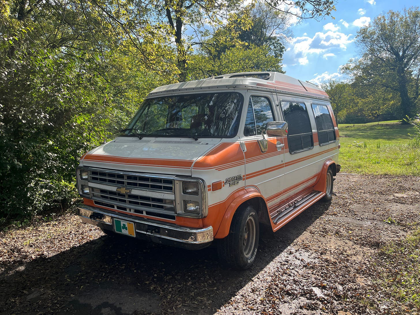 After delivering me safely to my gigs this month, and putting on nearly a thousand miles (the most in one month in our time together), it was time to give Big Orange a bath. Every year, there is one tree in our backyard that provides the perfect environment in the autumn for some insect friends to gather and then drop their excrement right down onto my beautiful Chevrolet. This month has been so filled with things to do of higher priority, that I let the sticky black stuff pile up on my roof and upper-exposed parts of the van, and created a small dilemma for myself: Do I reward her and wash now, or wait until all the leaves are done dropping for the year? I decided that Big Orange deserved some cleanliness, even though there are still plenty of leaves on that tree, and spent a solid four hours enjoying the process. We all deserve to freshen up our lives, even if we’re just going to get dirty again soon. I mainly just wanted to gift you this moment of looking at my van. You’re welcome.